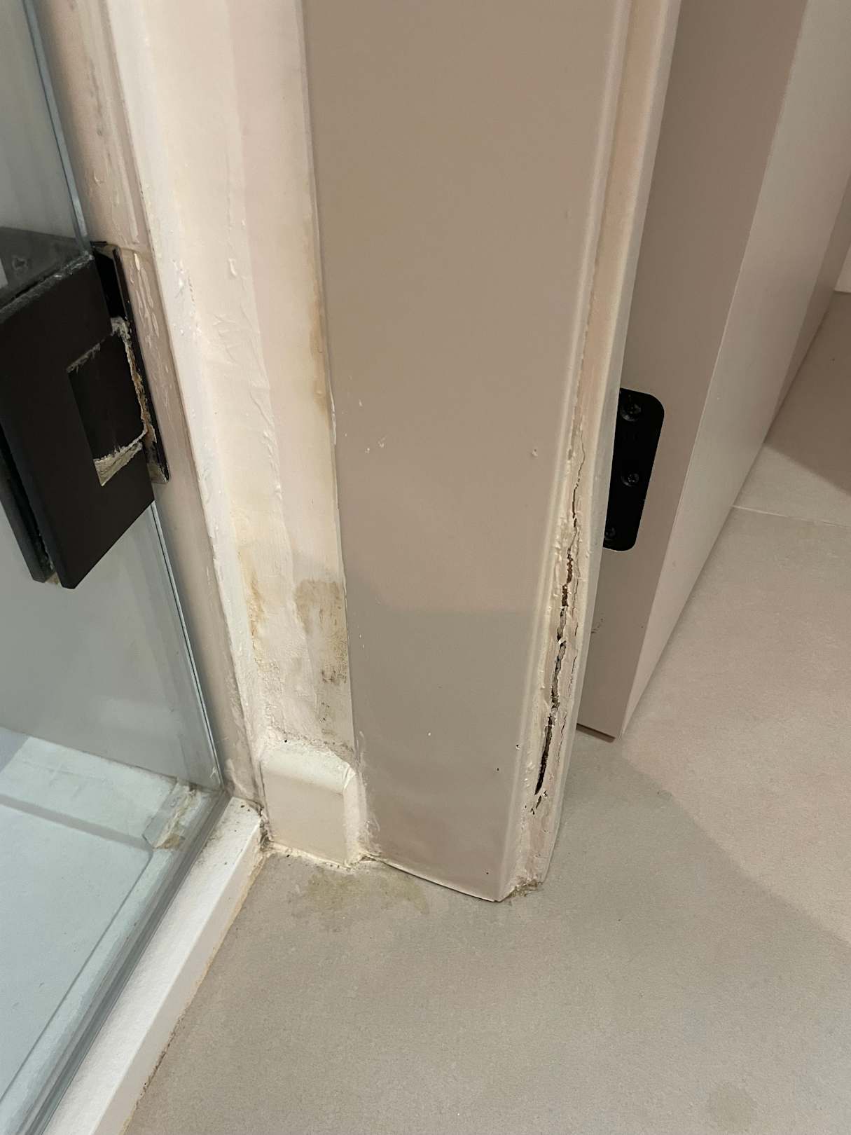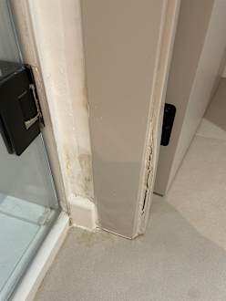 Komplett schimmelnde Ecke / Türrahmen neben der Duschtüre.