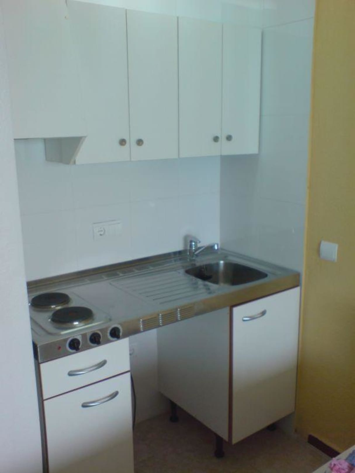 KochnischeSpüle, 2 Kochplatten, ein paar Töpfe und etwas Geschirr ist auch vorhanden. Kühlschrank auch, steht aber auf der anderen Seite