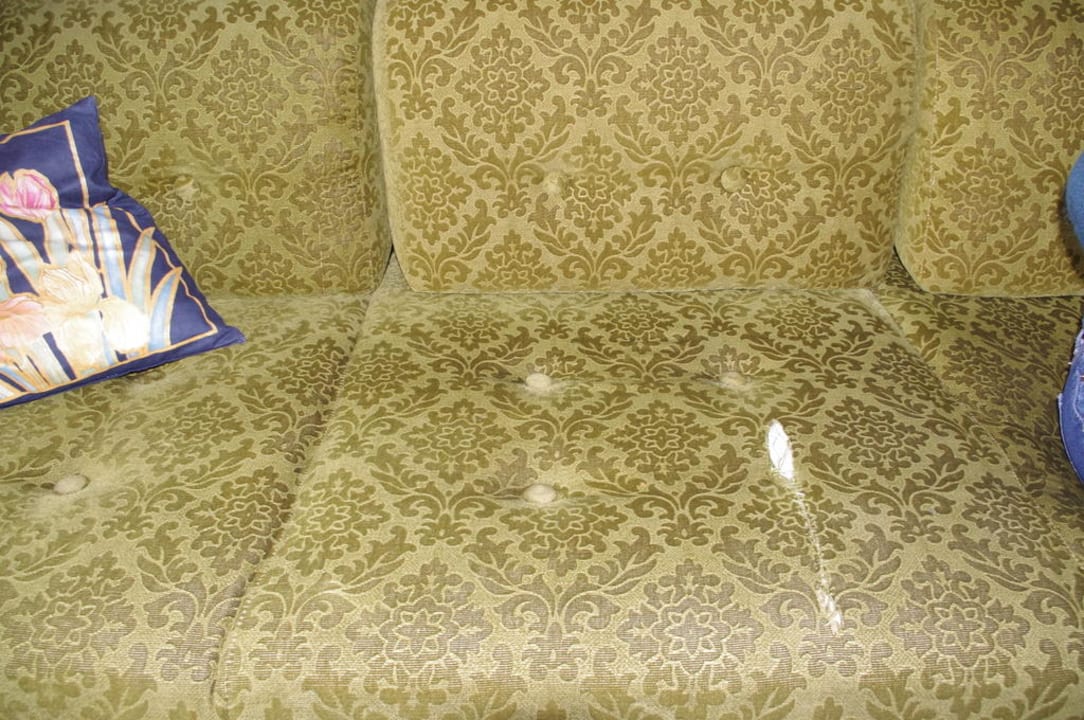 zerissenes und teilweise notdürftig geflicktes Sofa