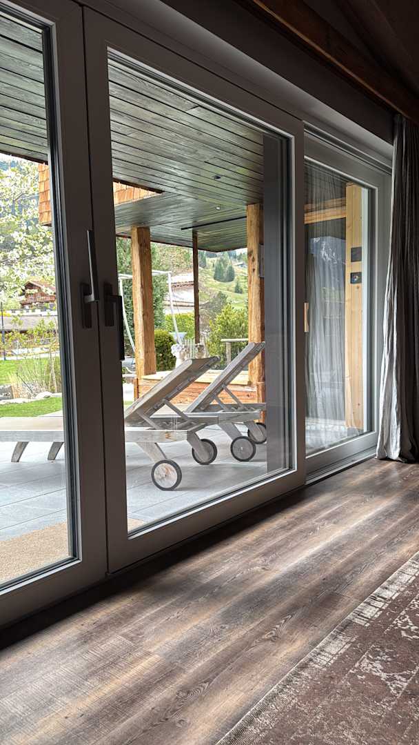 2 sehr bequeme Liegen auf der Terrasse; außerdem noch ein Tisch mit vier Stühlen. Man sieht die Außen Sauna mit dem verspiegelten Glas, so dass man auch von dieser Seite die tollen Berge von der linken Seite sehen kann.