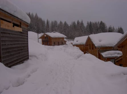 Der Weg durch´s Hüttendorf Richtung Piste