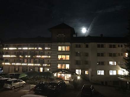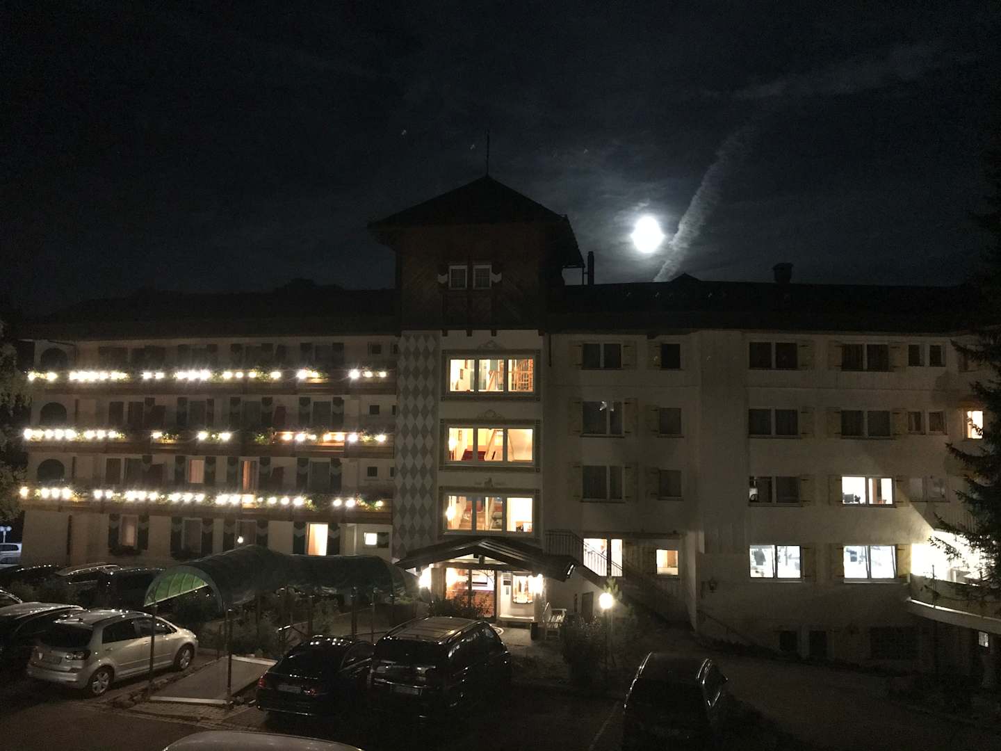 Beleuchtetes Hotel bei klarer Vollmond Nacht