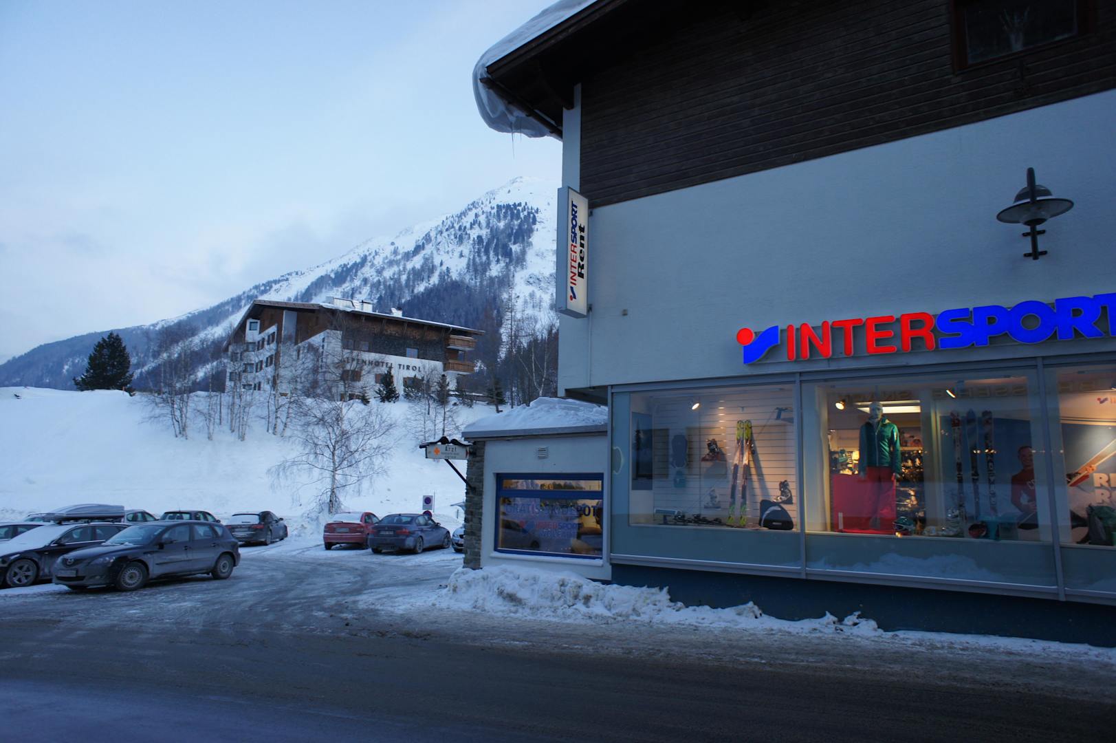 Alpenhotel Tirol gesehen vom Intersport WolfartDas Foto zeigt das Alpenhotel Tirol im Hintergrund auf der Anhöhe vom Blickwinkel des Intersportgeschäfts Wolfart her. Gäste des Hotels deponieren ihre Skier und Skistiefel in diesem Geschäft über Nacht.