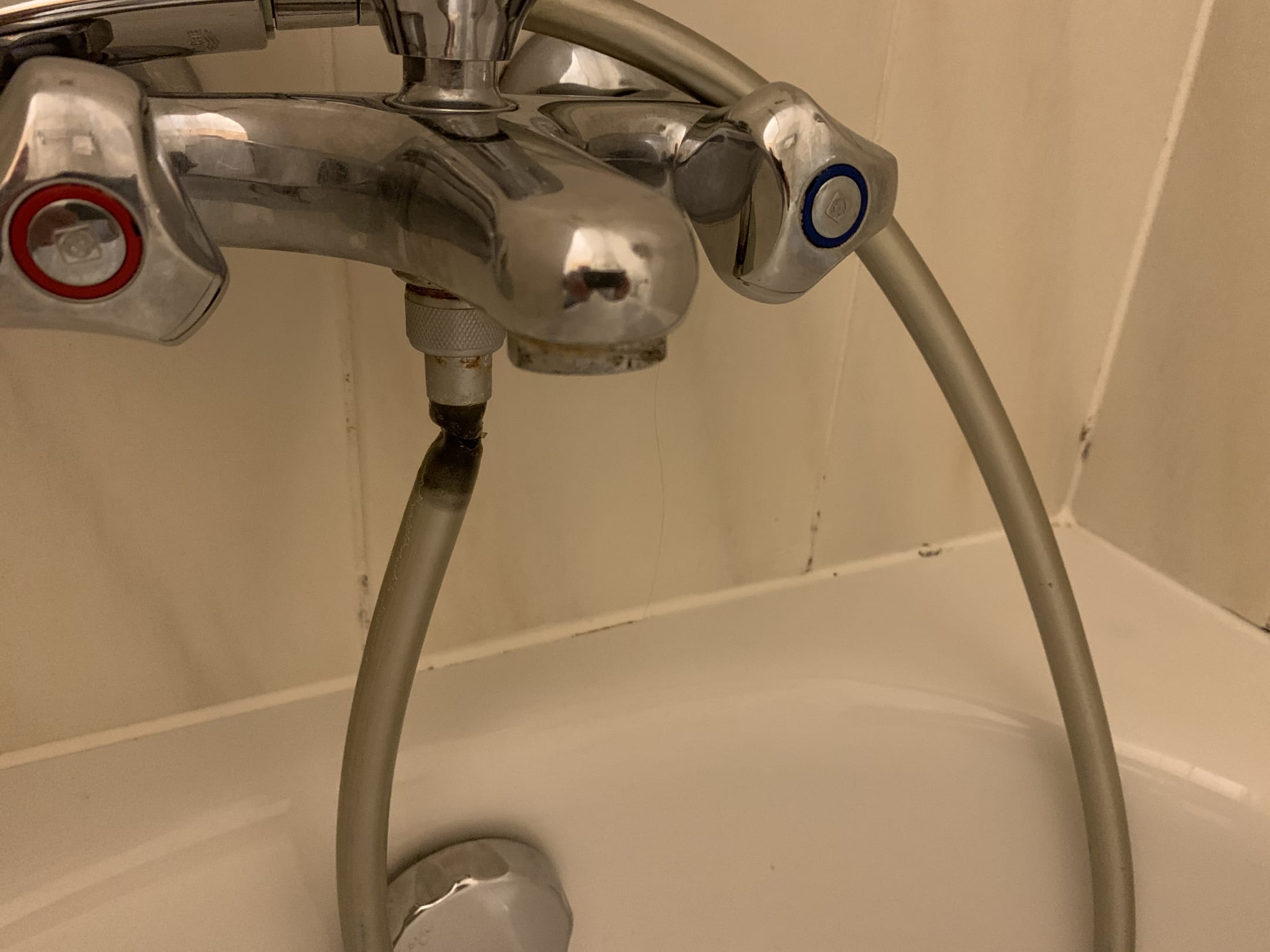 Man beachte auch die schönen Schimmelfugen und den tollen neuwertigen Dusch-Schlauch.