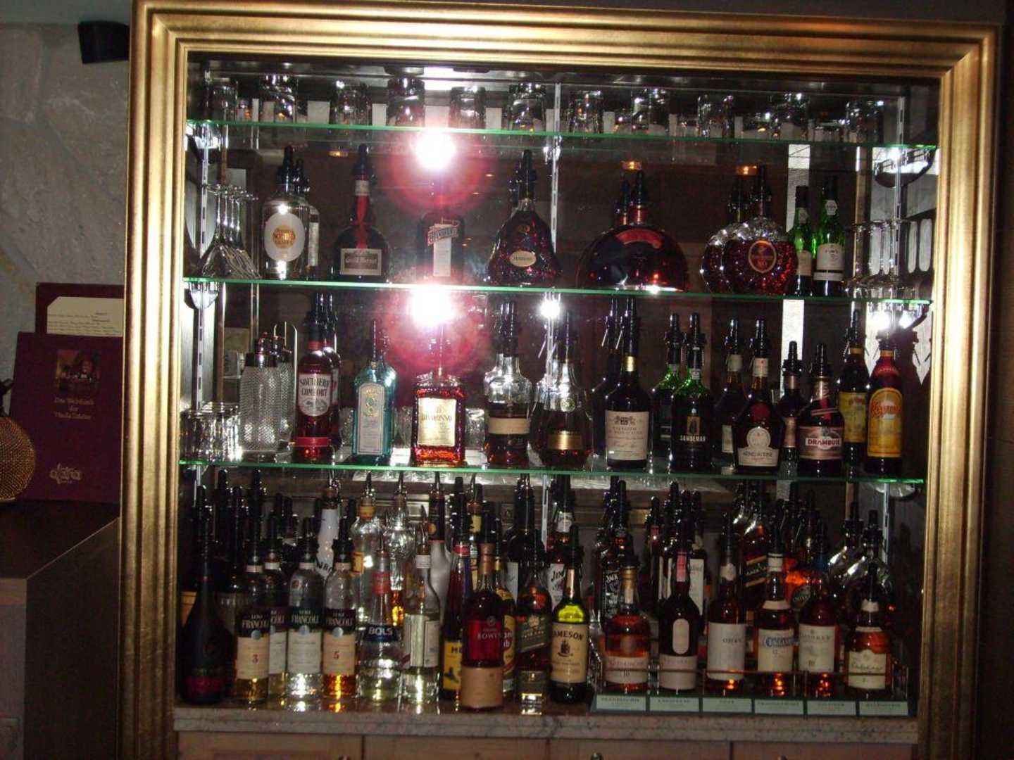 Die Getränke der Tagesbar in einer schönen Vitrine. (Aber das sind noch nicht alle.)