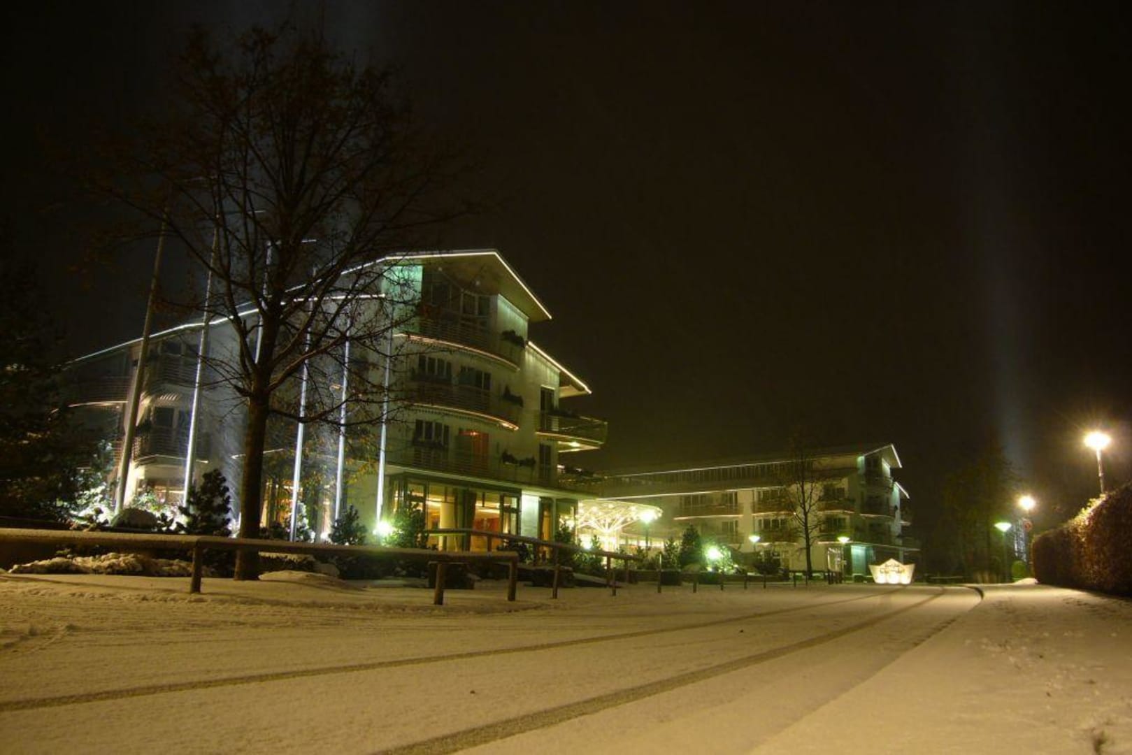 Seehotel im nächtlichen Schnee