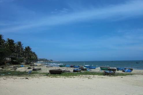 Blick vom Hotelstrand nach links zu den typischen runden Fischerbooten