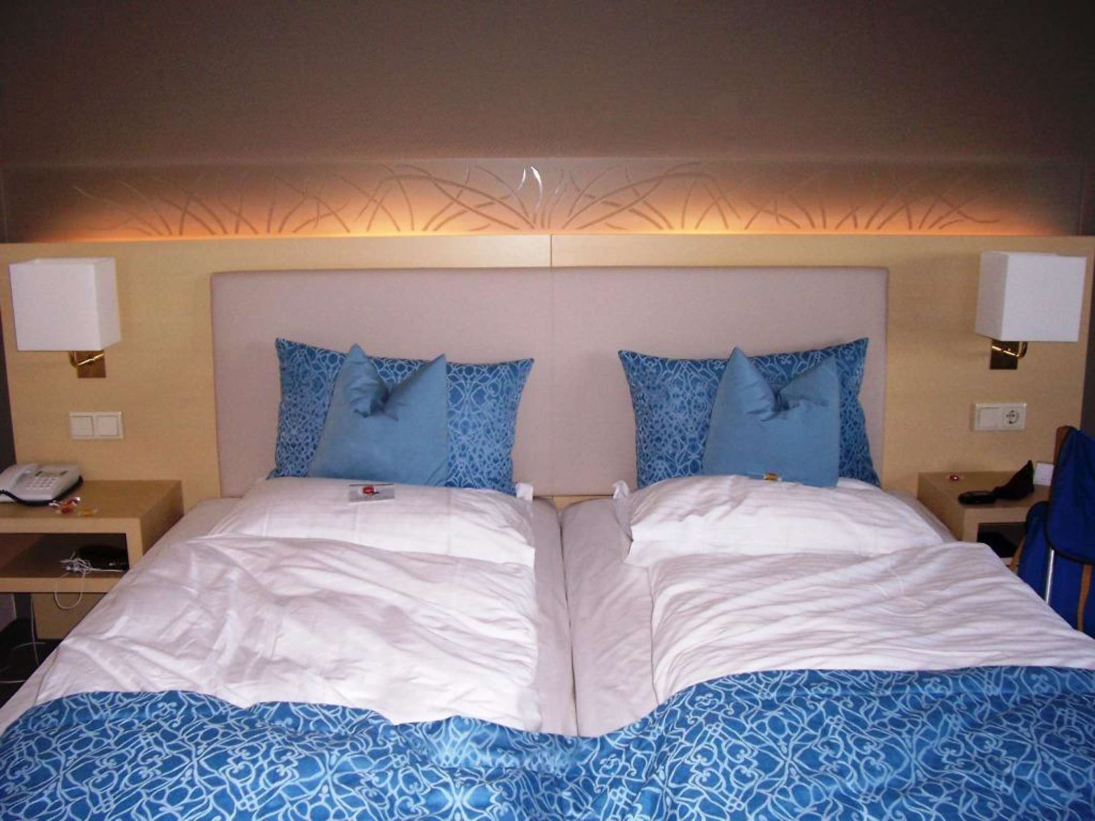 DoppelbettzimmerDoppelbettzimmer abends fotografiert. Das Bett wird jeden Tag von der Putzfrau gemacht und wir fanden jeden Tag eine neue Tüte Gummibärchen auf unserem Kissen. Auch unsere Schlafkleidung wurde liebevoll zusammengelegt.