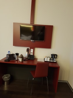 ZimmerSchreibtisch mit Wasserkocher, Kaffee und Tee usw. zum Wohlfühlen.