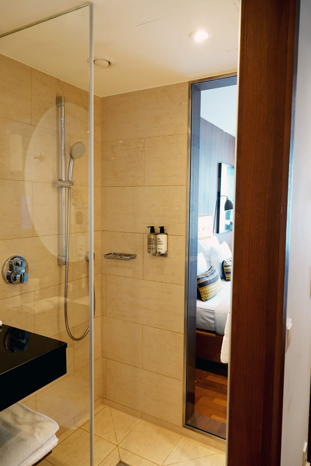 Dusche mit "bodentiefem Fenster". Dies lässt sich aber durch einen Vorhang zuziehen.