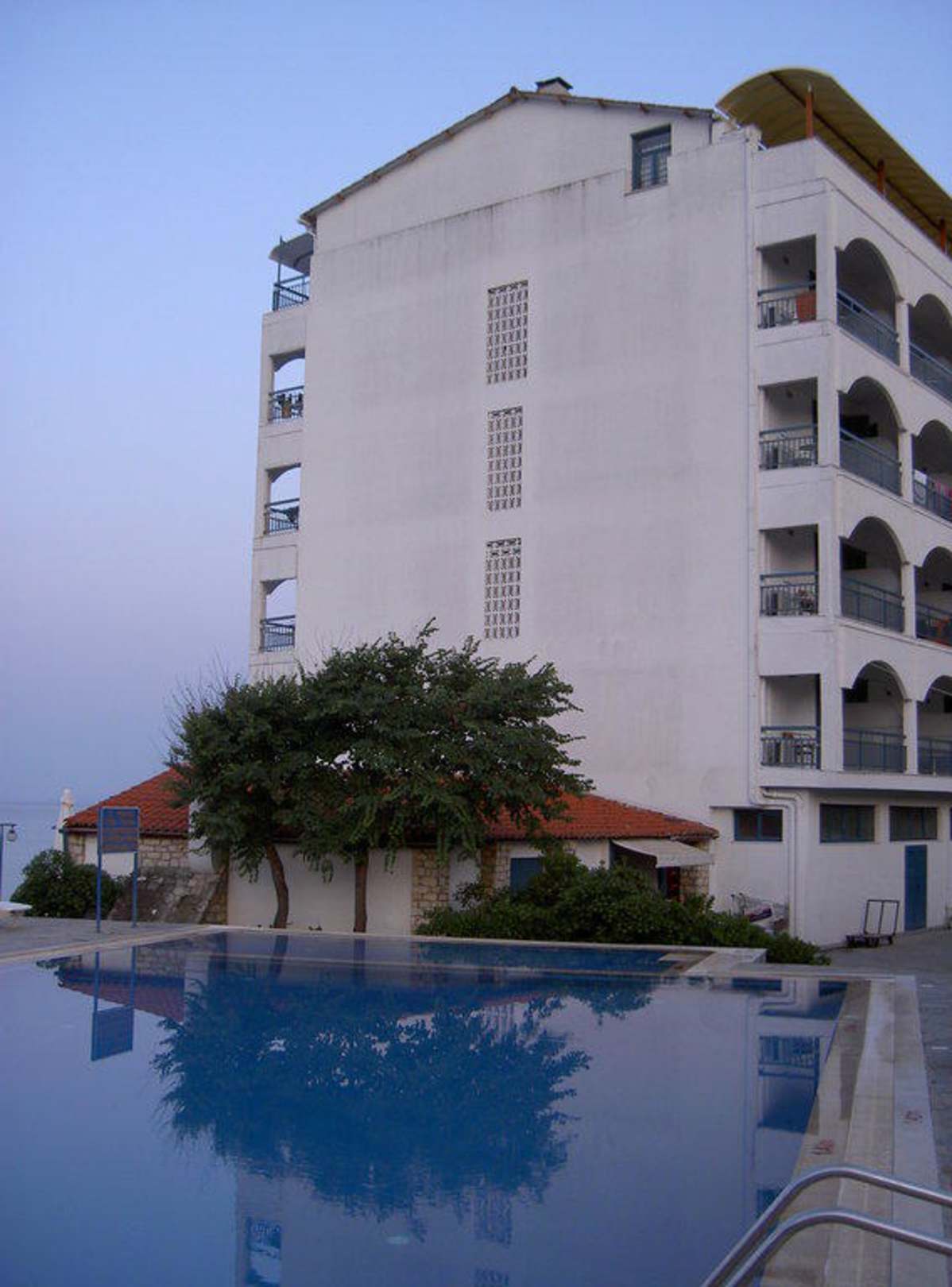 Blick vom Pool in Richtung Hotellinks geht es zum Strand, auf den man inklusive Meer wunderbar blicken kann.
