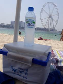 StrandKühlbox vom Hotel mit eisgekühlten Wasser. Blick auf das Dubai Eye, dass größte Riesenrad. Fertigstellung 2018