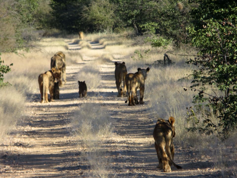 Eine Gruppe von ca. 13 Löwen direkt vor dem Camp