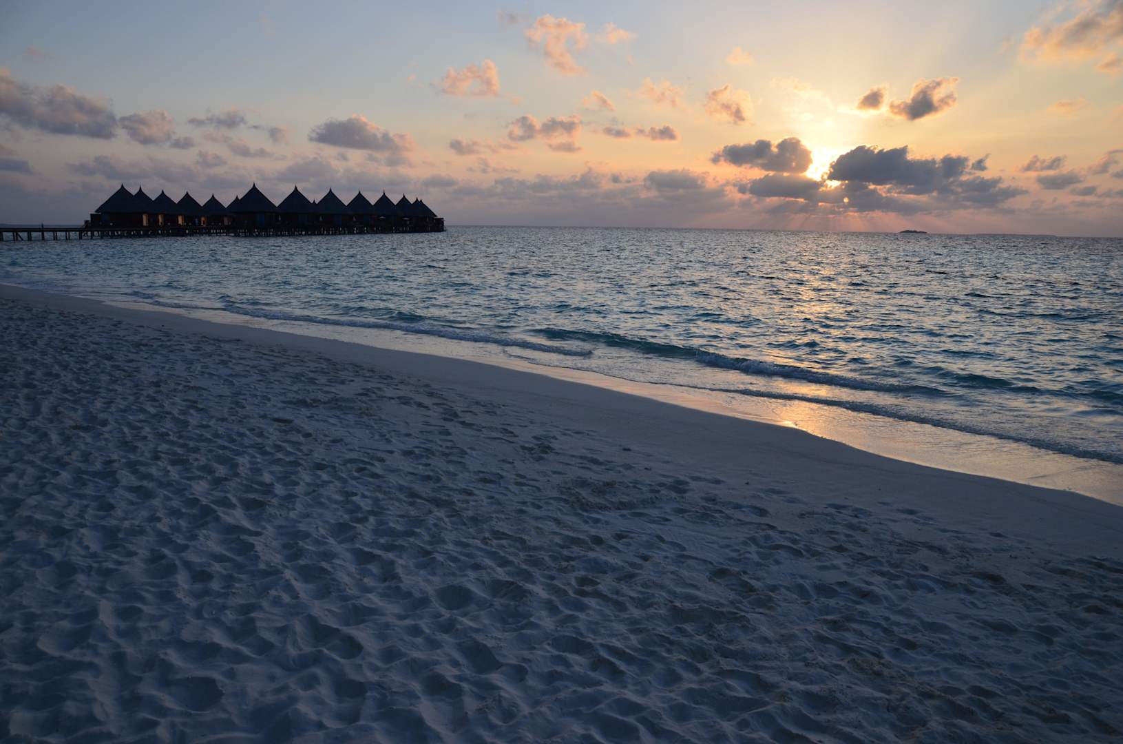Wasserbungalows bei Sonnenuntergang