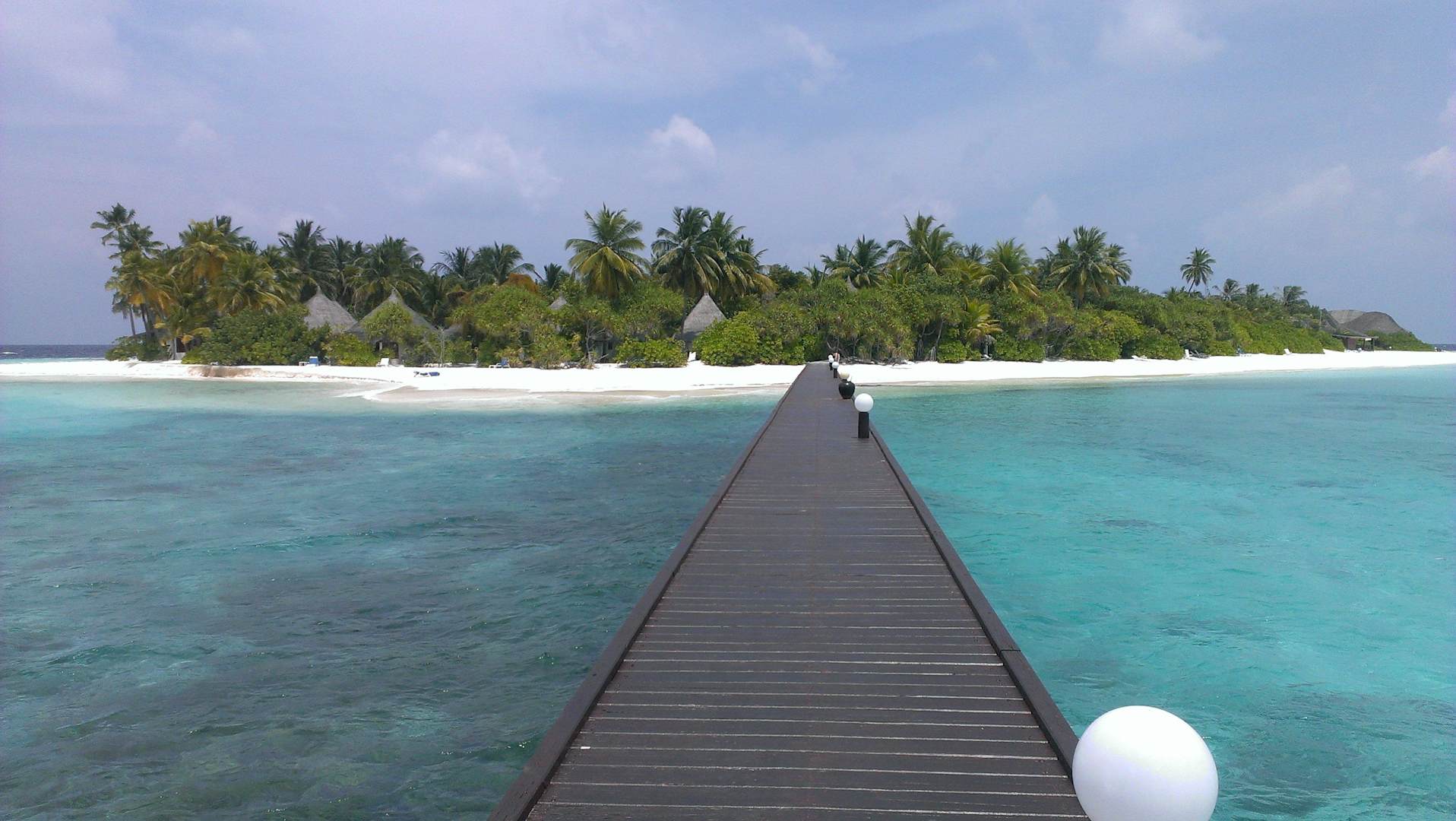 Blick vom Steg der Wasserbungalows zur Insel