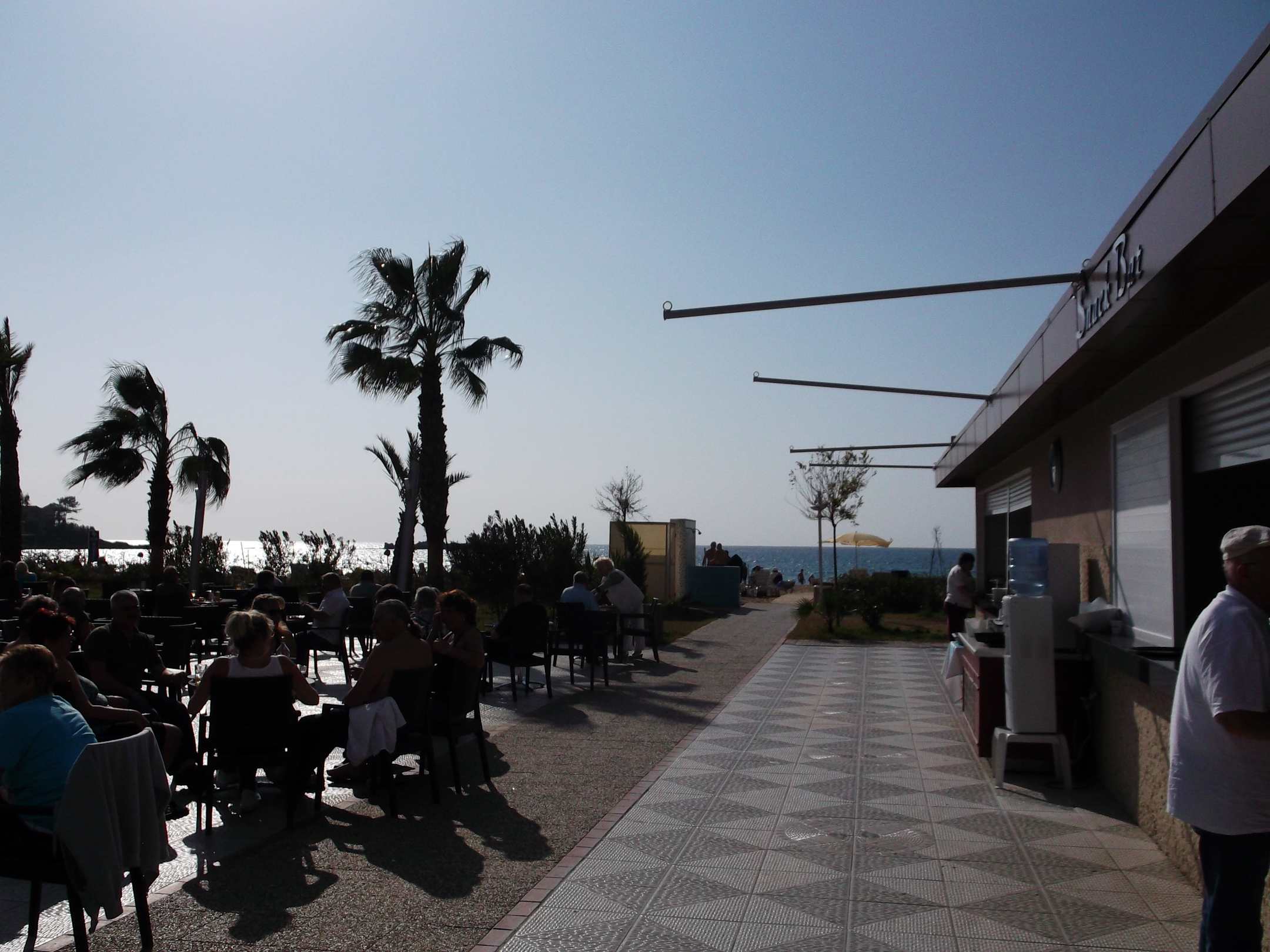 Blick zum Strand rechts Snackbar und AI Angebot