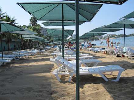 Die Strandanlage. Links sind die Tischtennistische und die Strandbar, die man nur trocken und ohne Sand an den Füßen betretten darf.