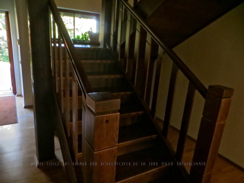 Eingang und Treppenhaus eines Gebäudes, in dem sich Hotelzimmer befinden.