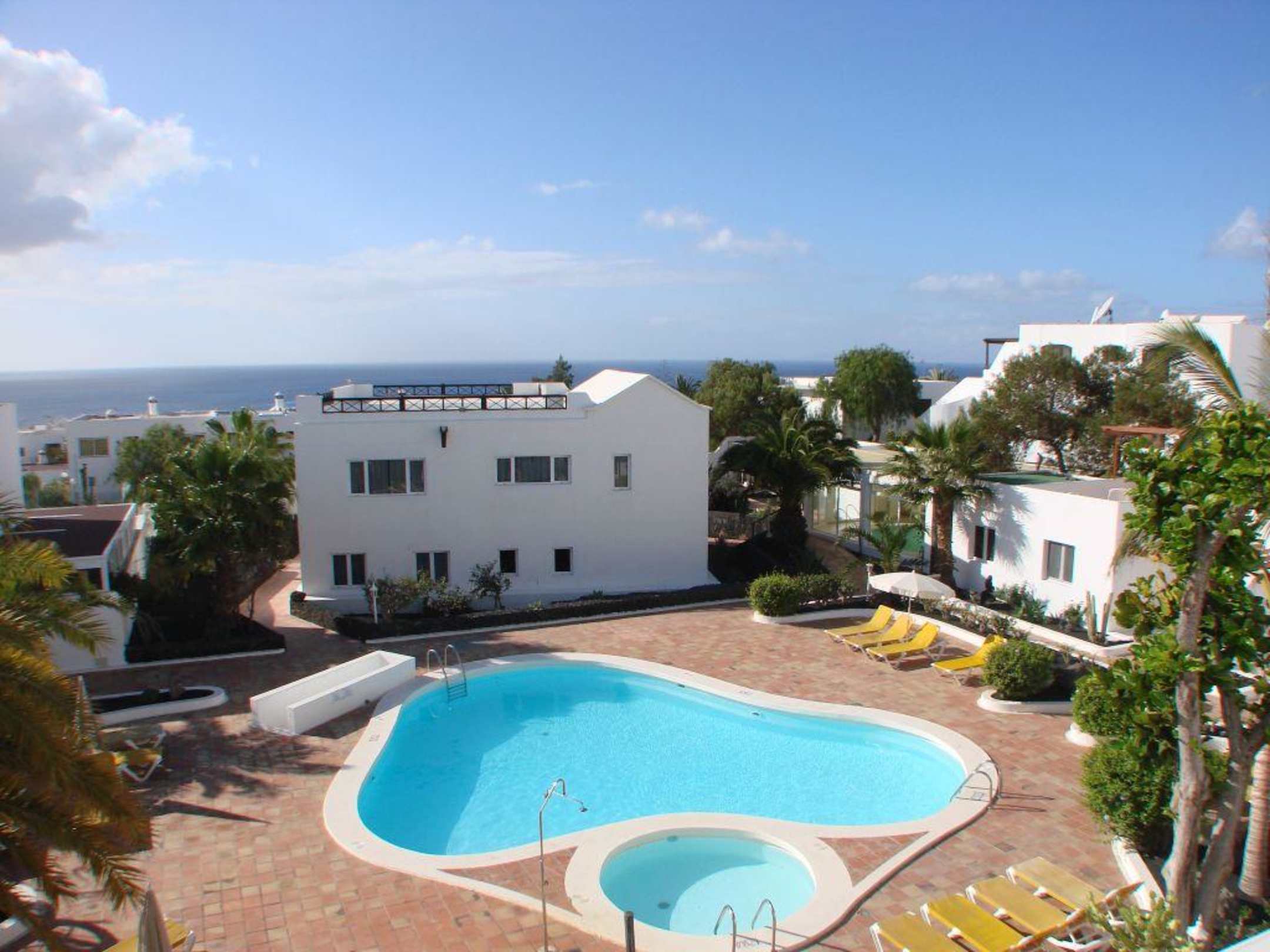 Appartement im 2. OG. Im Vordergrund unbeheizter Pool und dahinter das Therapiezentrum.