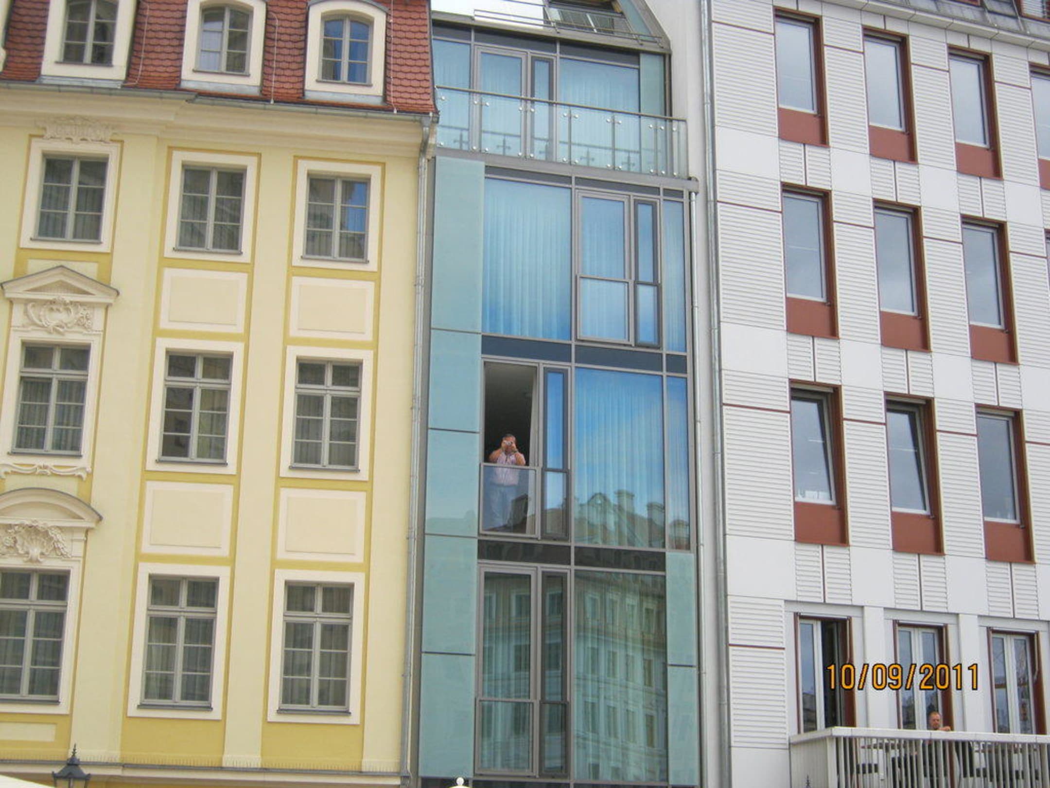 Einige Apartments, unter anderem das behindertengerechte haben diese riesen Panoramafenster. Man liegt im Bett oder sitzt auf der Couch und schaut auf die Frauenkirche.