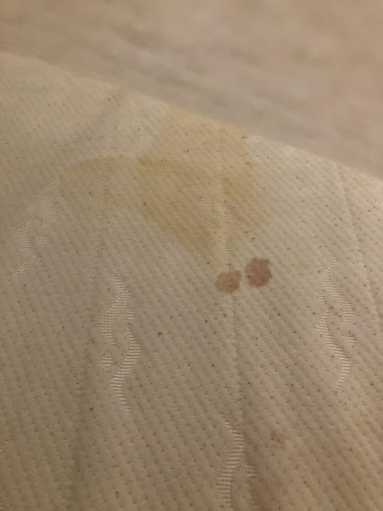 Hier ein Teil der Matratze. Leider sah der Rest genauso aus. Man sieht deutlich, dass hier keine Reinigung stattgefunden hat. Die Blut und Urinflecken waren sogar durch das Bettlaken zu erkennen. EKELHAFT !