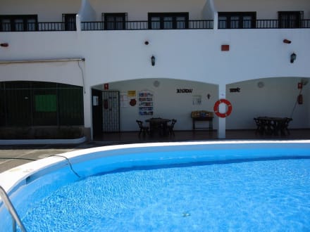 Pool mit Blick auf die Rezeption und den darüberliegenden Apartmens.