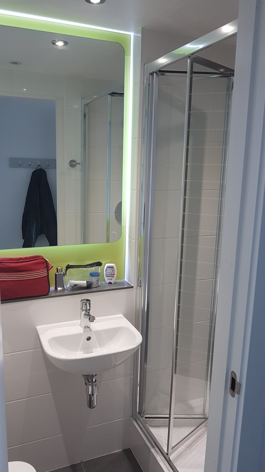 Das Badezimmer (WC, Waschbecken, Dusche) ist zwar ziemlich klein, aber sauber und modern. Licht und Lüfter werden durch Bewegungsmelder gesteuert, wobei die Nachlaufzeit deutlich kürzer sein könnte.