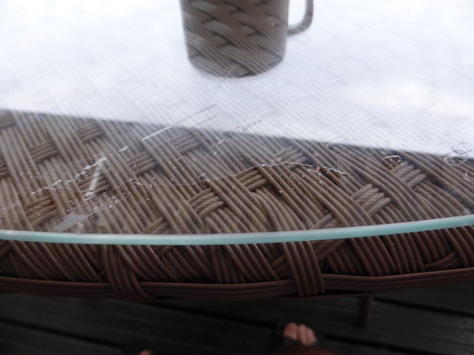 Leider nicht besonders zu erkennen: Die Tische aussen würden nicht besonders oft und gut gereinigt. Zum Glück gab es jeden Tag einen kleinen Schauer. Der hat das Schlimmste weggwaschen. Nur die Tische unterhalb des Daches: ...