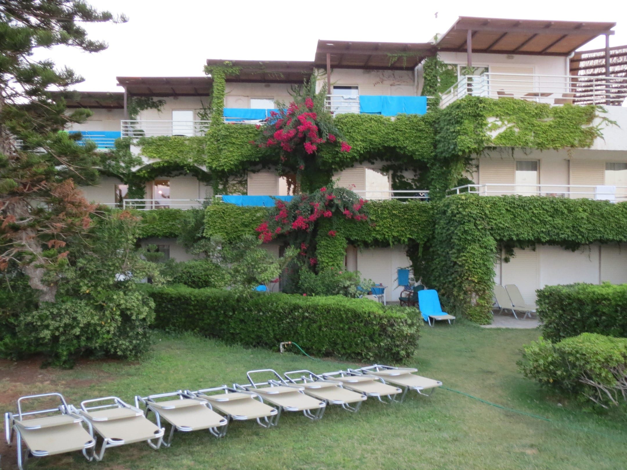 Auf dem Bild sieht man, daß es auch auf den Wiesen des Hotels Liegen gibt. Die Bade-Handtücher werden auf den Balkons auch sehr schnell trocken. Es gibt viele grüne Pflanzen und Flächen im gesamten Hotel-Gelände.