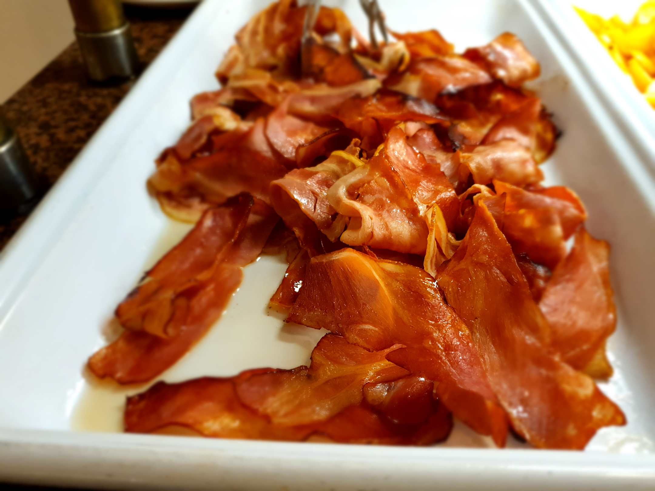 Es gibt zu jeder Mahlzeit frisch gebratenen Speck. Speziell zum frischen Rührei (Frühstücks-Büfett) eine tolle Ergänzung für ein ausgewogenes aber auch üppiges Frühstück im Hauptrestaurant.