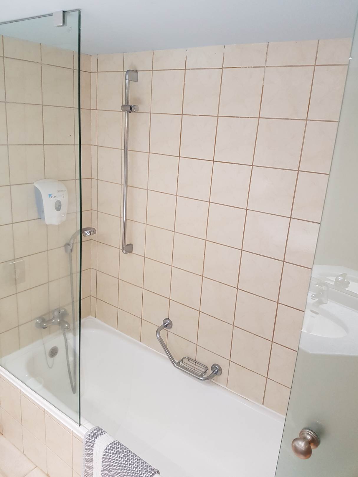 Badewanne mit Dusche und großem Body-Wash-Lotion-Spender im Bad-Bereich Bungalow. Ein Fuß-Tuch ist vorhanden, um einen sicheren und angenehmen Ausstieg aus der Dusche/Wanne zu gewährleisten.