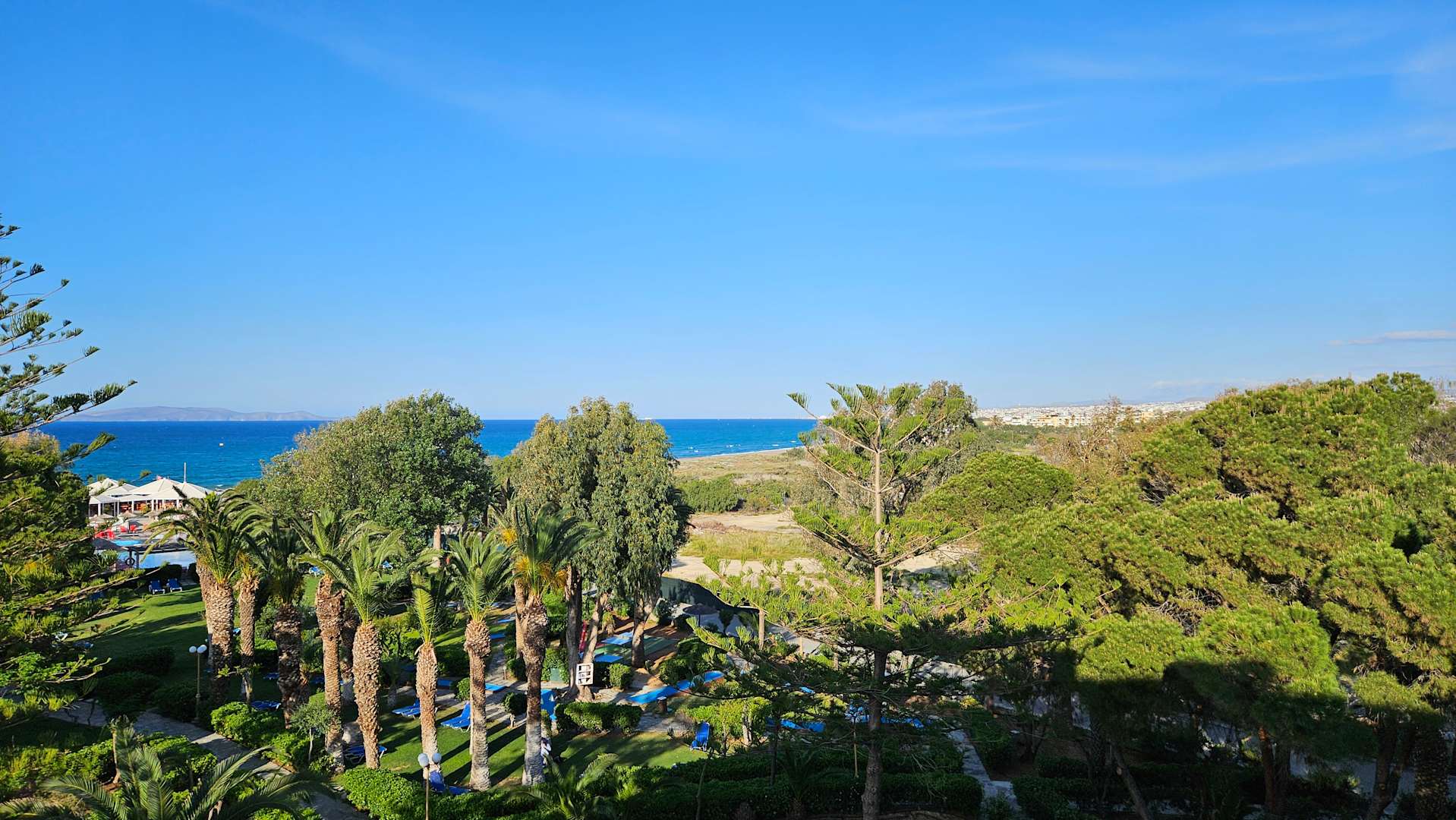 Blick vom Hotelzimmer 4. Etage auf den Garten + Hauptpool und seitlicher Meerblick