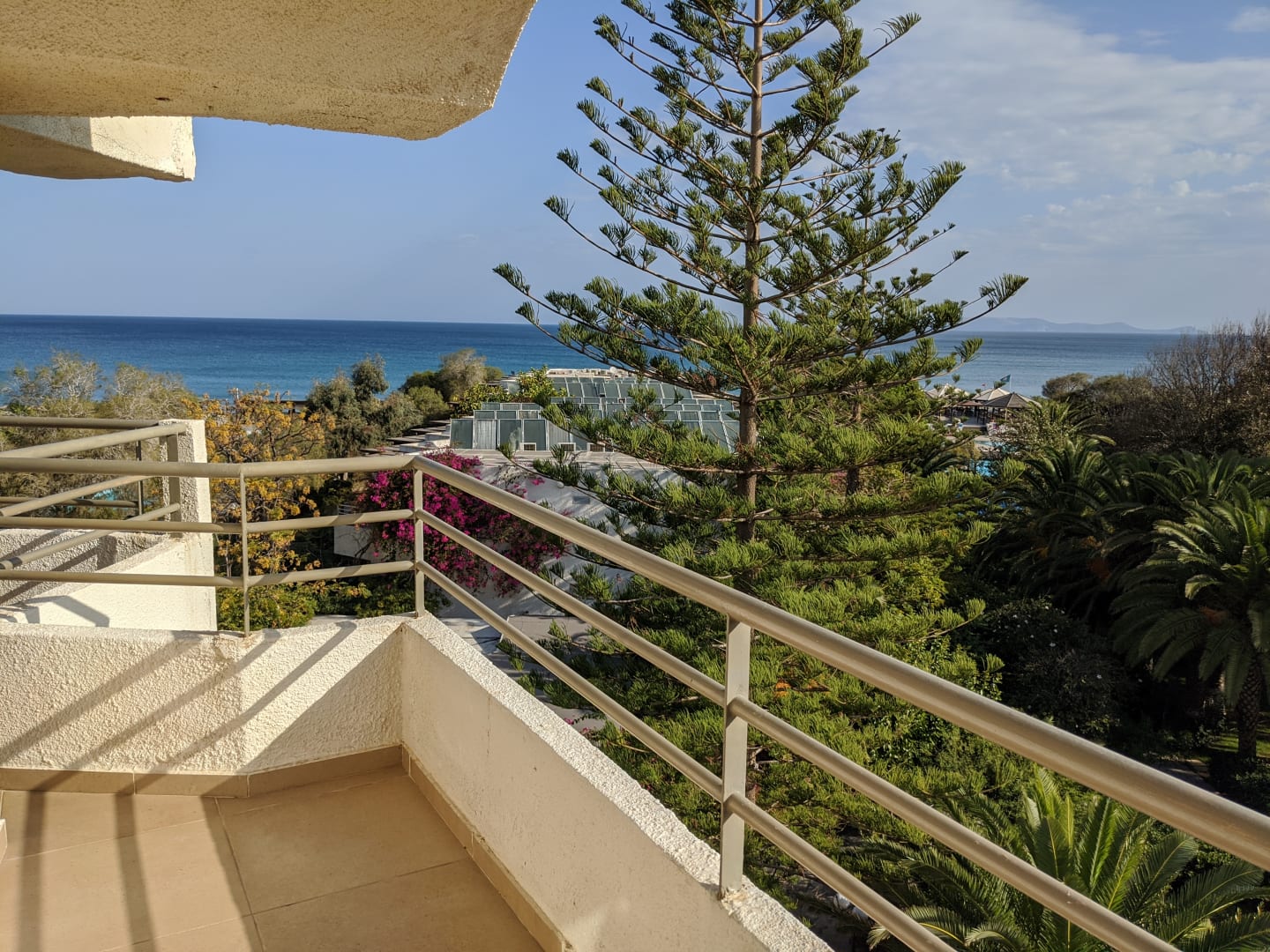 Ein Teil des sehr großen Balkon von Zimmer 436 b. Im Hintergrund sieht man Solar-Anlagen von den Bungalows. Der erzeugte Öko-Strom wird für die Warmwasserversorgung des Hotels genutzt.