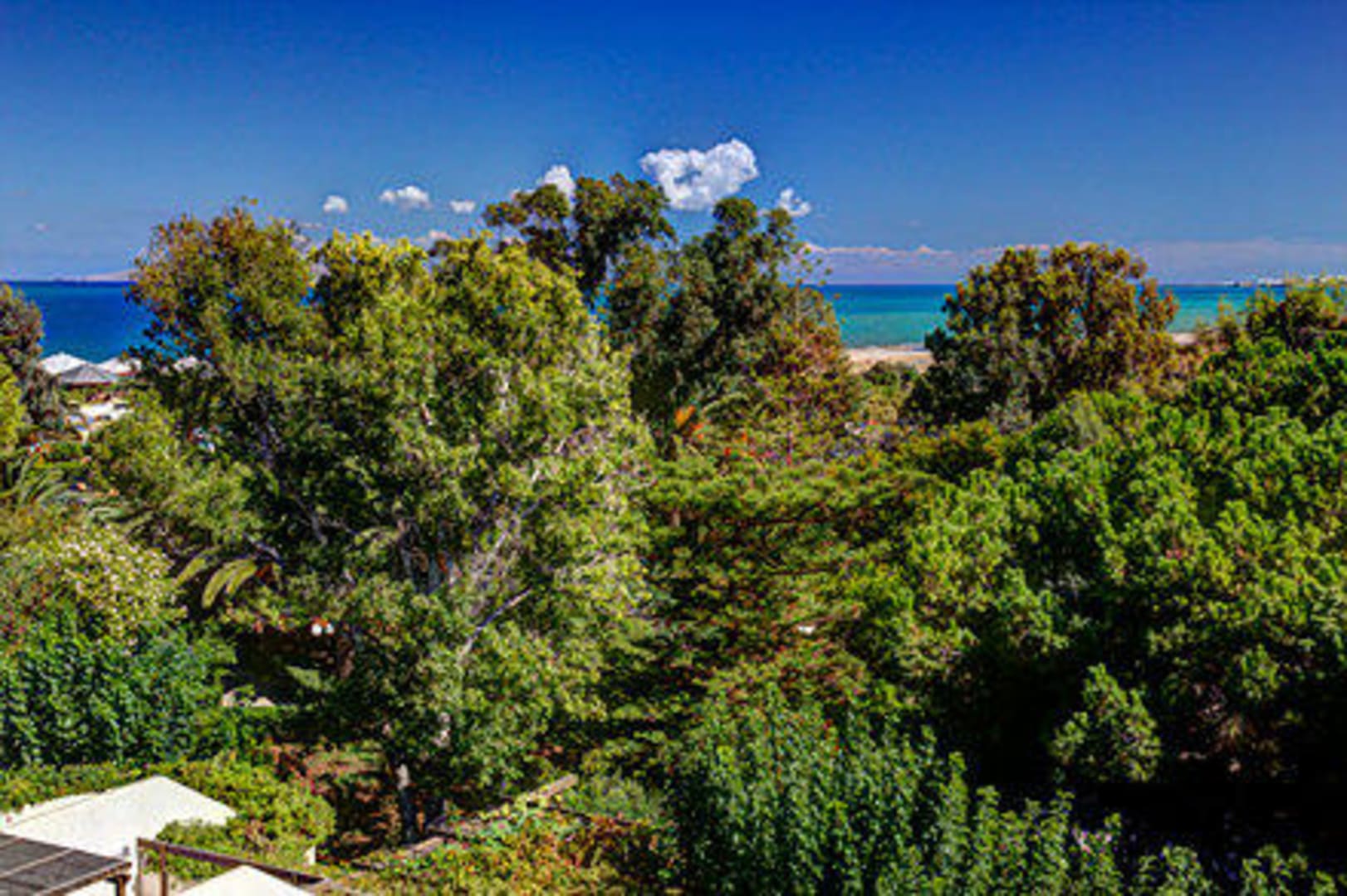 Der Ausblick von unserem super Zimmer. Am Tag der Garten und das Meer, bei Nacht die Stadt und die Flieger. Für Zweifler, es ist eine HDR-Aufnahme.
