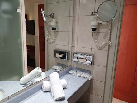 Im Bad gibt es auch Hygienetücher, Hauslatschen, Fön und Rasierspiegel.