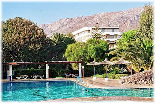 Poolanlage und Haupthaus von der Snackbar aus gesehen.
