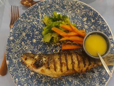 a la carte beim Griechen Wolfsbarsch mit Gemüse und Zitronensoße