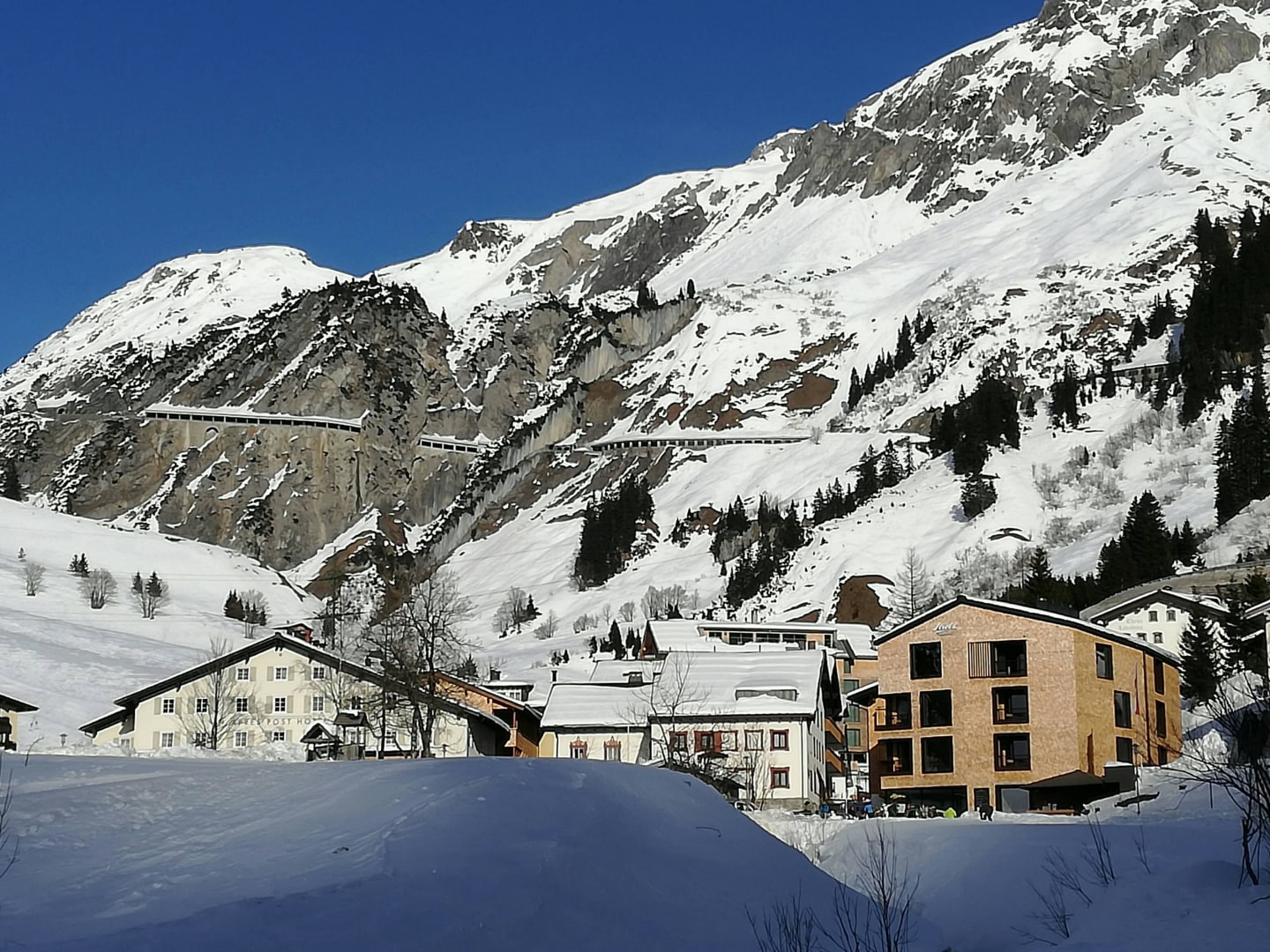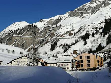Stuben in der AbendsonneIm HIntergrund die in den Fels gehauene Flexenstraße nach Zürs und Lech am Arlberg.