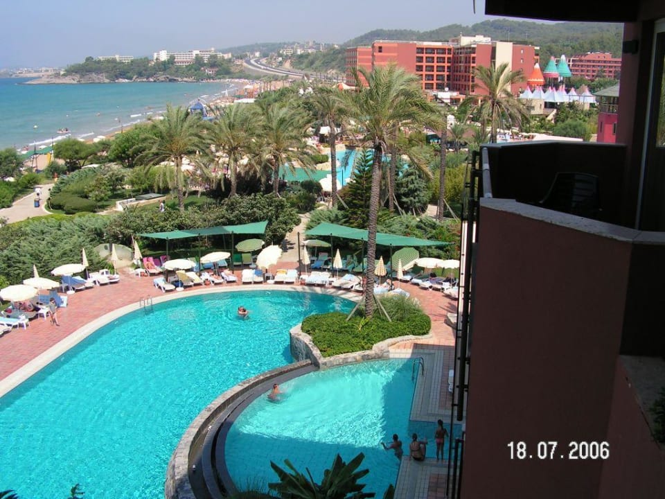 Blick aus der 2. Etage auf den Aussenschwimmbereich des Hallenbades, mit vorgelagertem Pool. Im Hintergrund die Hauptpoolanlage und das JOY Pegasos Royal.
