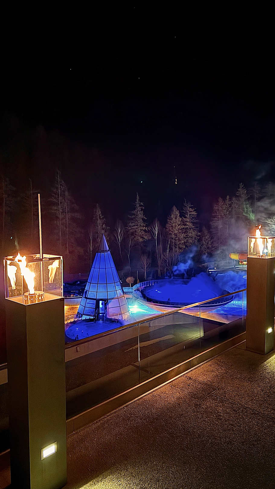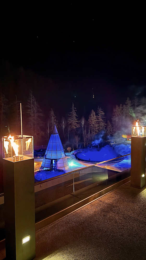 Blick vom Spa 3000 (Hotel-Spa) auf die Pools der Therme (in die man ebenfalls gehen kann)