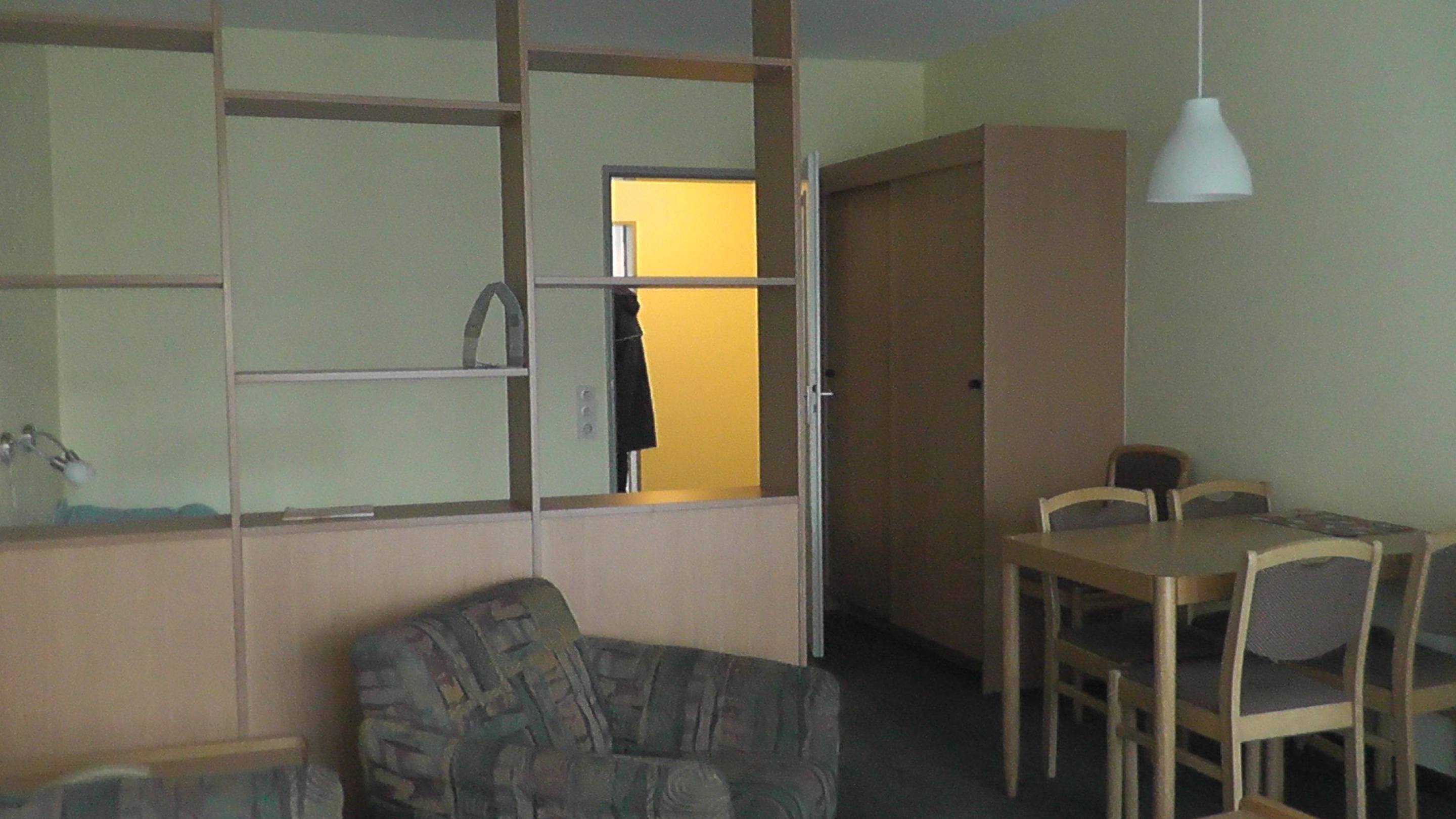 Wohnzimmer Ferienwohnung mit 2 Betten hinter Regal