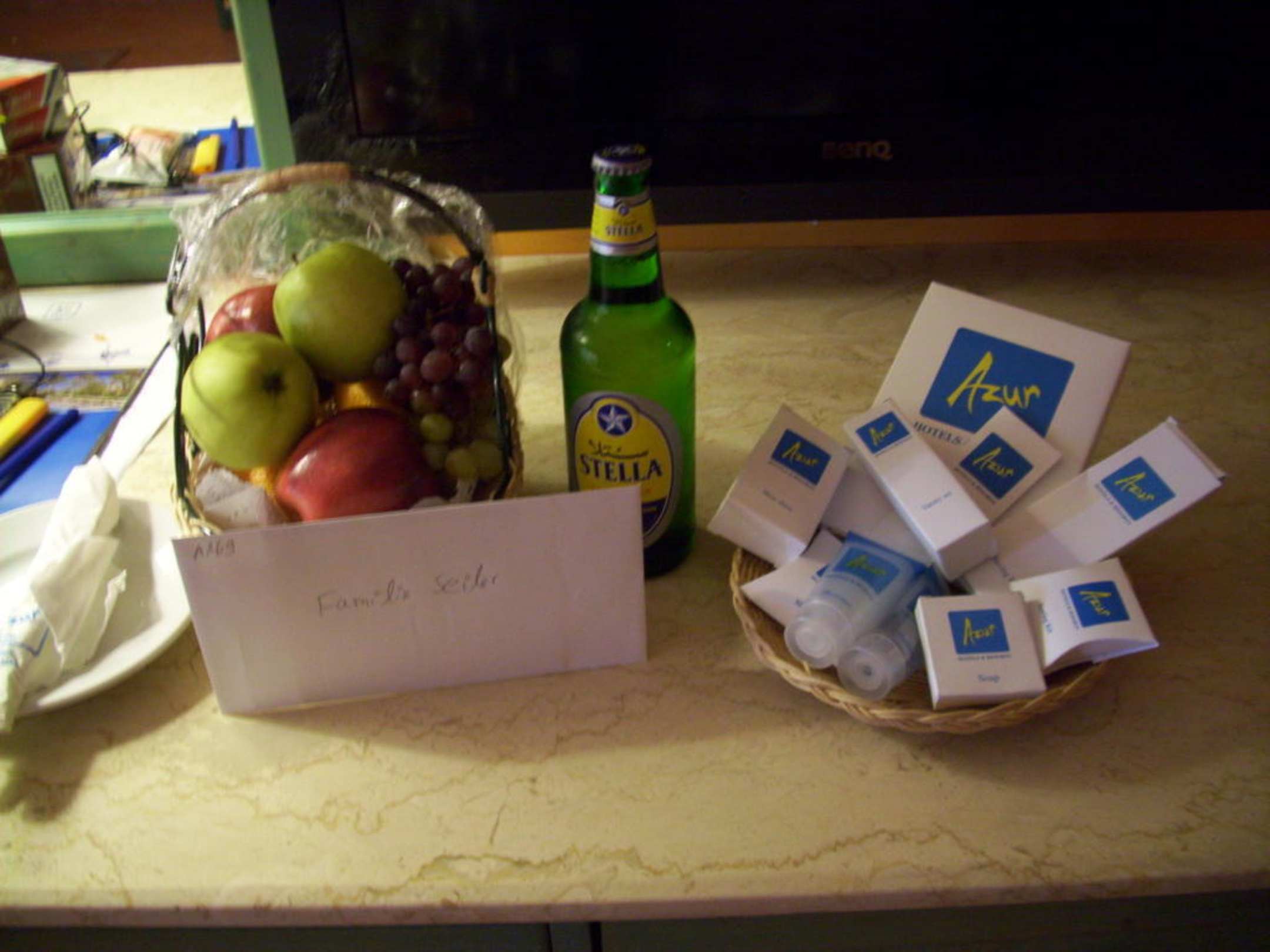 Hotel-Präsentekl. Obstkorb, 1 Fl. Bier und Azur-Kleinigkeiten als Hotel-Präsent auf dem Zimmer (wohl für den zweiten Hotelbesuch)