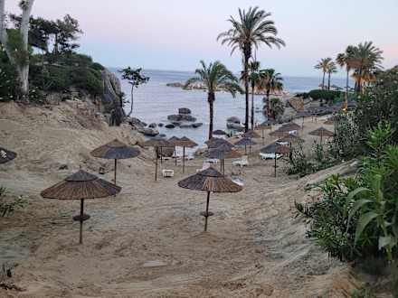 Einer der Strände, Sonnenschirme und Liegen sind natürlich frei.