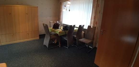 Der Tisch, für 6 Personen gedacht die am Tisch nicht passen. 1 Stuhl ist v. Tisch weg. Auch für 2 Erw. und 2 Kinder alle mit normalen BMI viel zu eng.