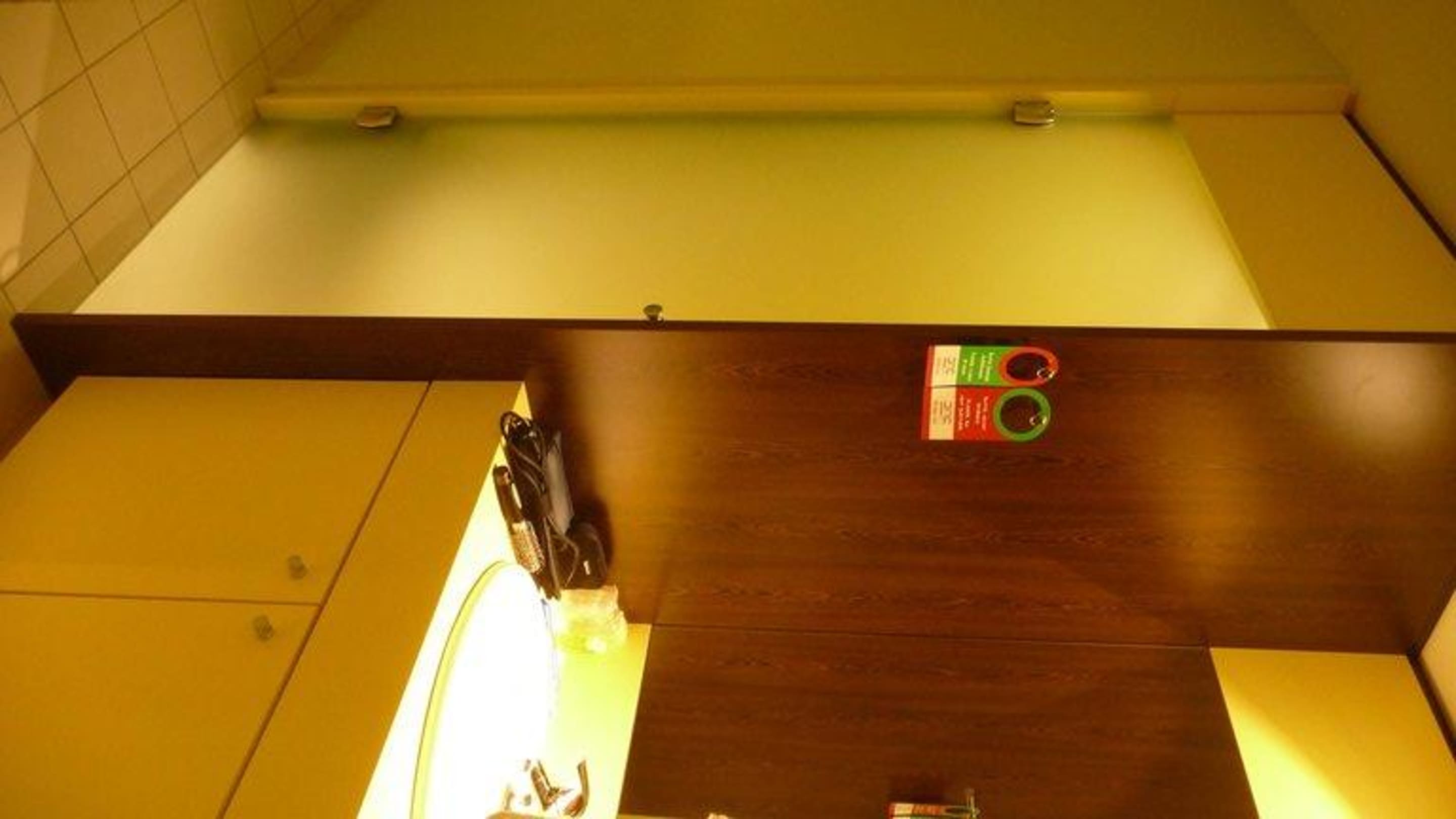 Der Waschbecken ist direkt in das Zimmer integriert. Hinter der Tür (rechts) ist eine Toilette. Etwas weiter auf der linken Seite ist noch so eine Tür, da ist dir Dusche.