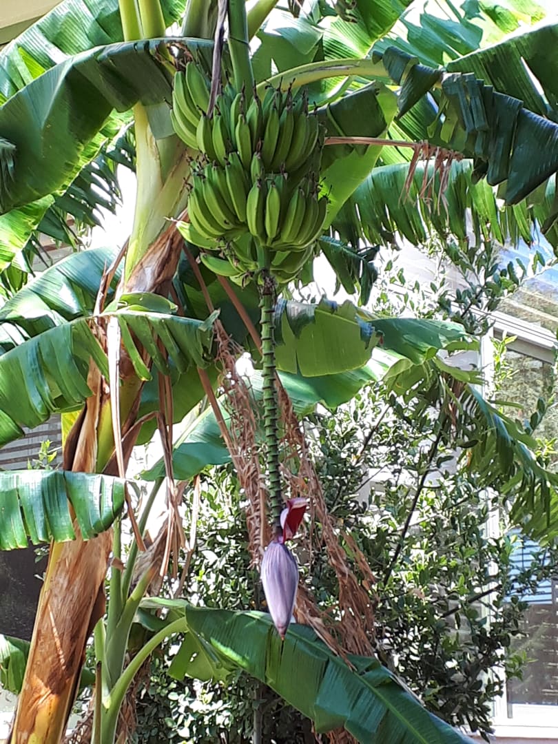 Bananenstaude mit Blüte und Früchten