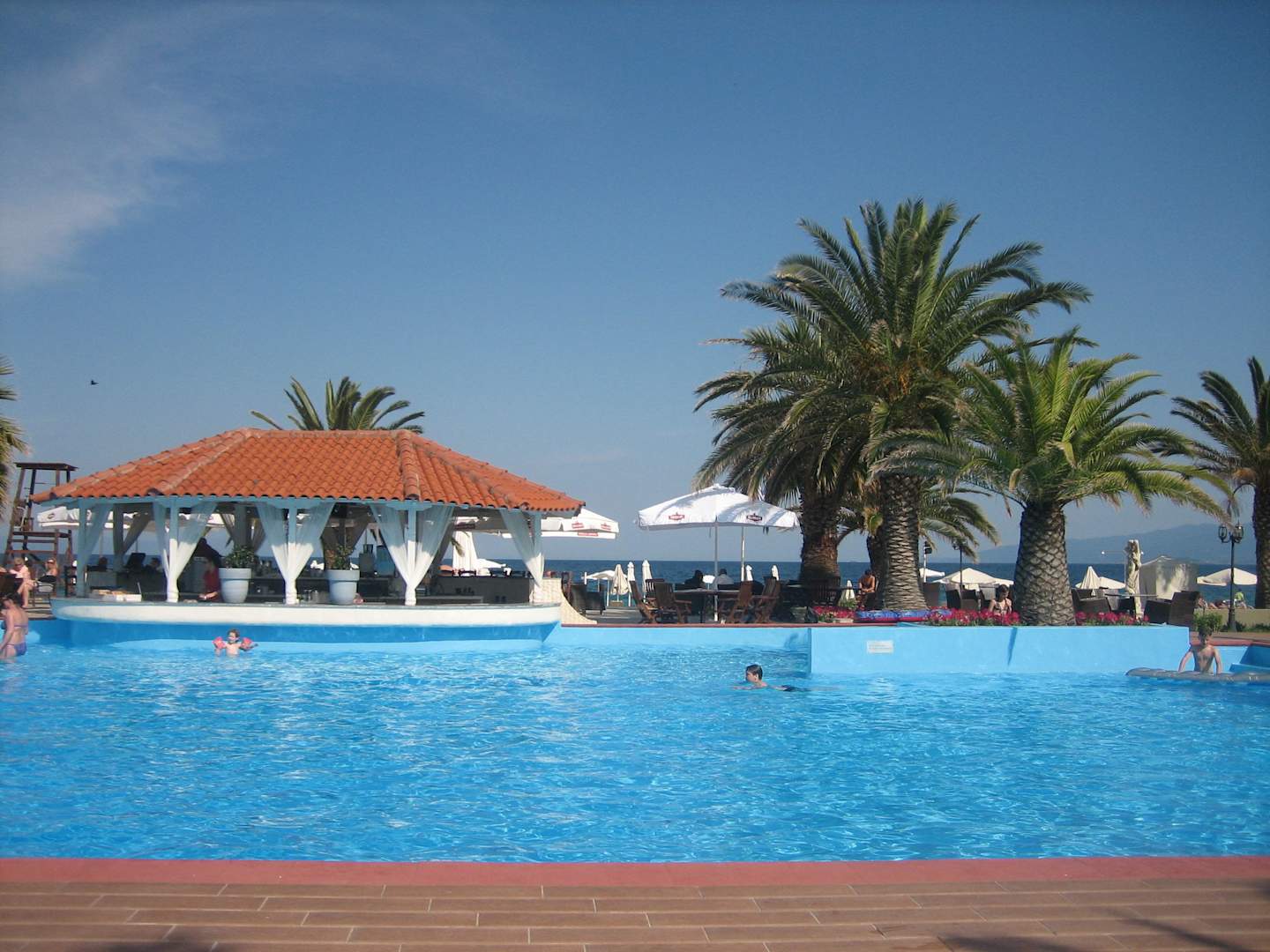 Poolanlage mit Poolbar, dahinter das Meer