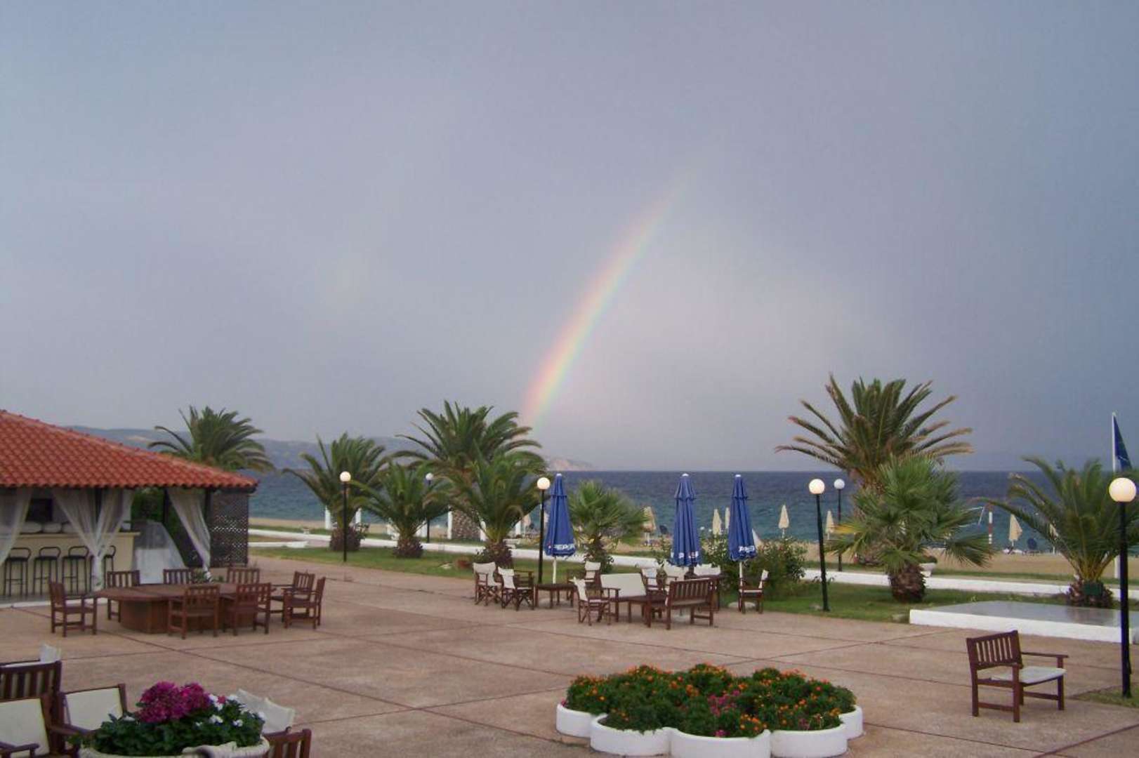 RegenbogenAuch ein Gewitterguss hat seine Reize. - Blick vom Restaurant zum Meer