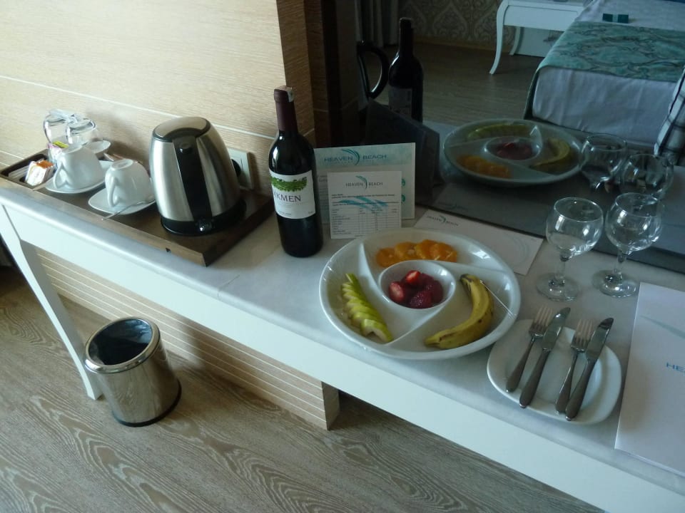 Begrüßungs-Geschenk-Obstteller und eine Flasche Rotwein !