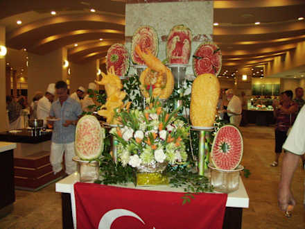 Eingangsbereich zum RestaurantJeden Abend wurden dieses geschitzte Obst aufgebaut, jede Woche ein anderes Motiv